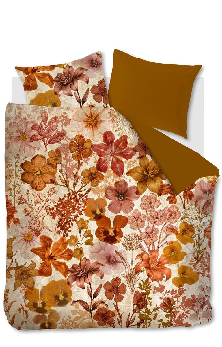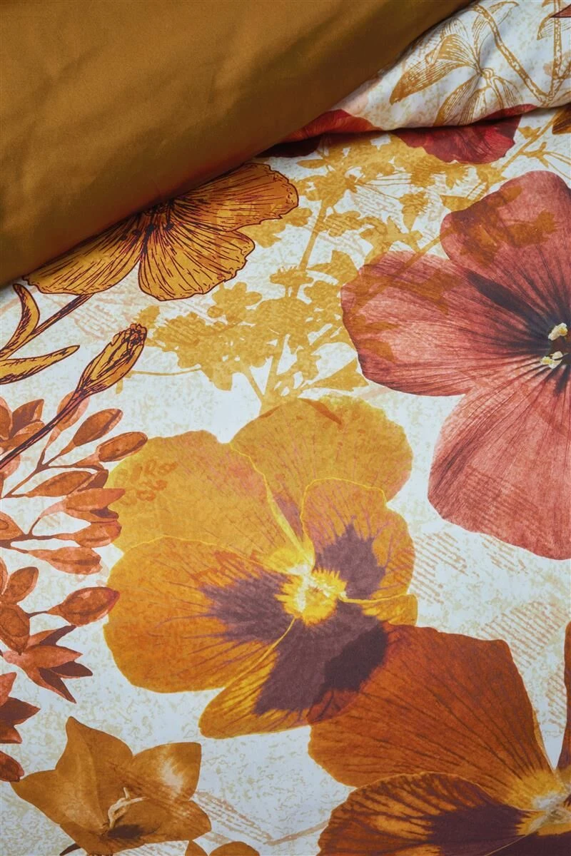 Die Bettwäsche Flora zaubert mit ihrer Mischung aus warmen Farben und fröhlichen Blumen ein Lächeln in jedes Gesicht. Die Digitaldrucktechnik und die Satinbindung sorgen dafür, dass die Bettwäsche elegant aussieht und sich wunderbar weich anfühlt. Die Rückseite des Bettbezugs ist in einem prachtvollen dunklen ockergelben Farbton gehalten.