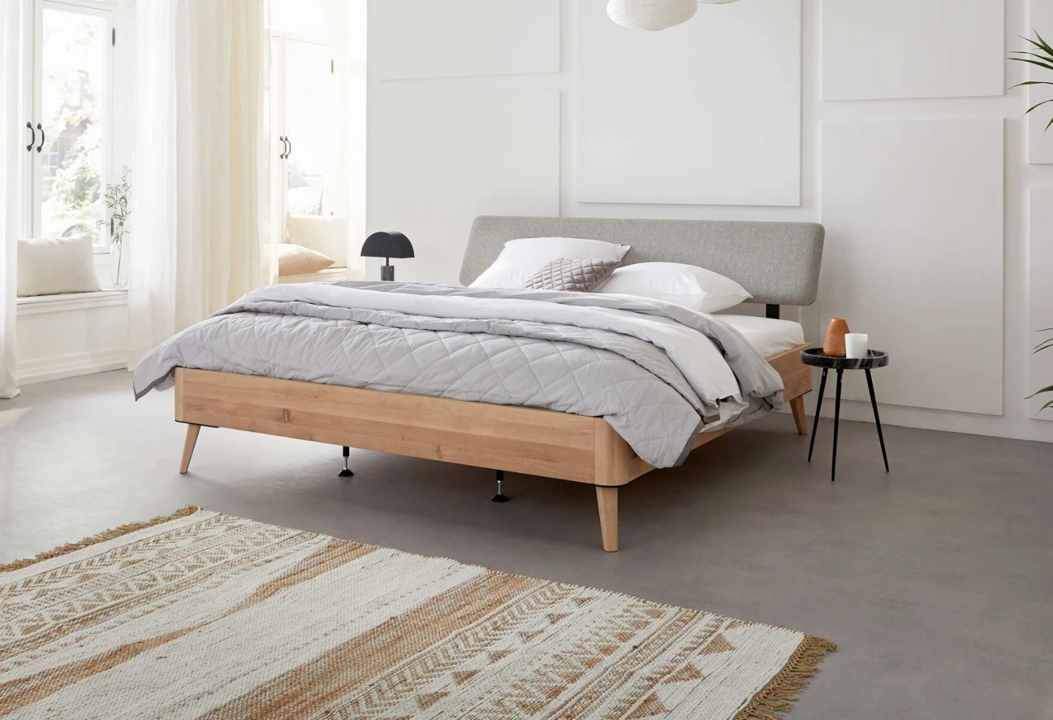 Das Bettgestell Balance Gentle hat elegante und sanfte Formen. Warme Holztöne, weicher Stoff und schwarzen Stahlelementen sorgen für die richtige Balance und eine ruhige Atmosphäre in Ihrem Schlafzimmer.