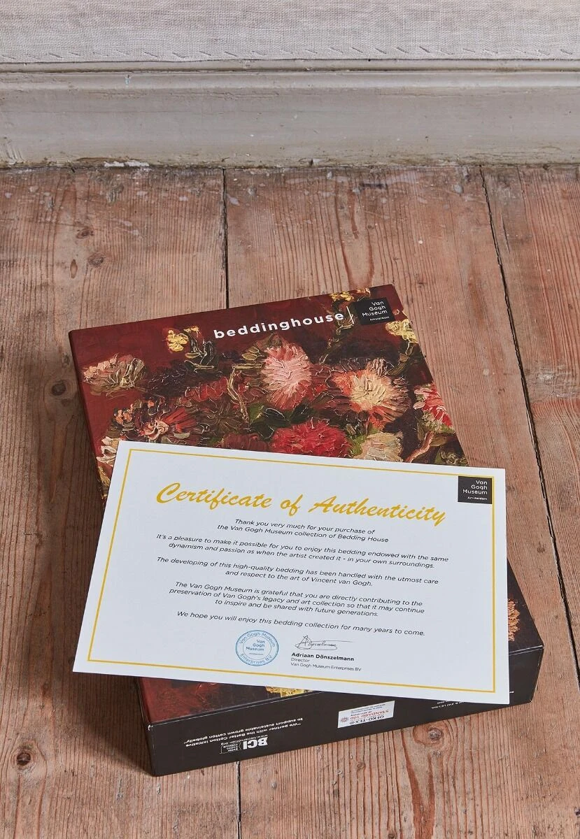 Van Gogh war mit Farbe nie sparsam umgegangen. Aber nachdem er im Juni 1886 die Blumenstillleben von Adolphe Monticelli (1824-1886) kennengelernt hatte, ging er noch weiter. Dieser französische Künstler malte bunte Blumensträuße mit dicker Farbe und kräftigen Pinselstrichen. In diesem Stillleben kann man sehen, wie kräftig van Gogh nun selbst auch die Blumen auf die Leinwand malte. Die dicke Farbe und die deutlich sichtbaren Pinselstriche sind auch auf der Bettwäsche gut zu sehen. Die Bettwäsche ist aus reinem Mako-Satin gefertigt. Der Bettbezug ist mit einem Reißverschluss ausgestattet. Die Bettwäsche ist bis 60 Grad waschbar, trocknergeeignet und kann gebügelt werden.