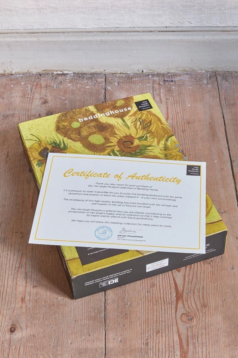 Die „Sonnenblumen“ sind weltweit eines der bekanntesten Werke van Goghs. Eine reiche Sinfonie verschiedener Gelb-, Orange- und Grüntöne. Mit dieser Serie dekorativer Sonnenblumen-Stillleben wollte van Gogh Eindruck auf seinen Freund Paul Gauguin machen. Van Gogh machte sich mit großem Fanatismus an diese Serie. Er musste schnell malen, weil die Blumen in einer Vase schnell verwelken: „Ich male jetzt mit demselben wütenden Eifer, mit dem ein Marseiller seine Bouillabaisse [provenzalische Fischsuppe] verzehrt. Das wird dich nicht wundern, wenn du hörst, dass ich große Sonnenblumen male.“ Gauguin fand die Gemälde tatsächlich äußerst gelungen und meinte, dass die Sonnenblumen für van Gogh eine charakteristische Handelsmarke seien. 1889 nahm van Gogh das Motiv neuerlich auf und schuf das Bild, das heute im Van Gogh Museum zu sehen ist. Die Bettwäsche ist aus reinem Mako-Satin gefertigt. Der Bettbezug ist mit einem Reißverschluss ausgestattet. Die Bettwäsche ist bis 60 Grad waschbar, trocknergeeignet und kann gebügelt werden.