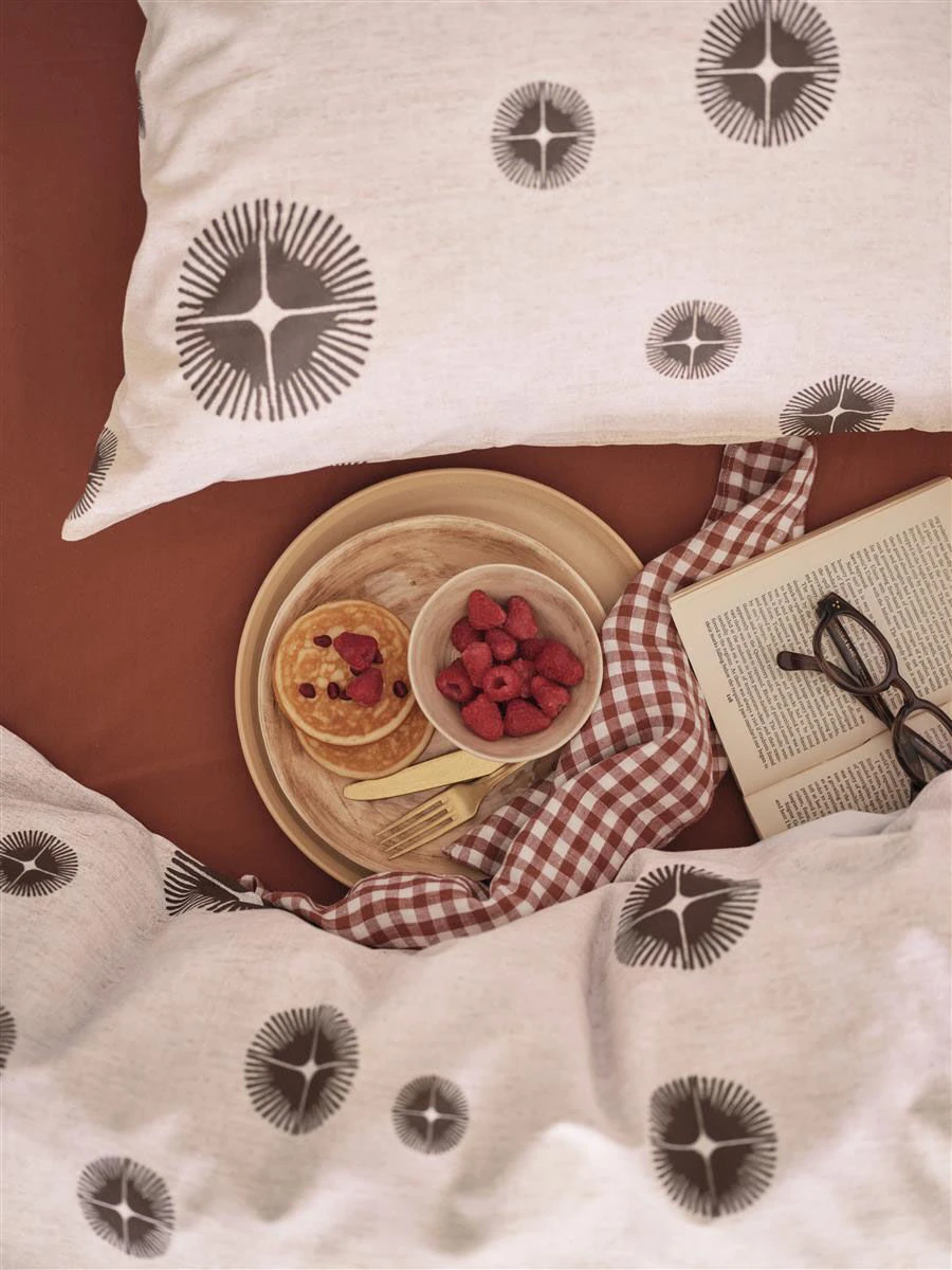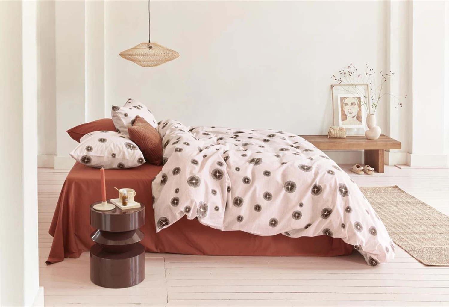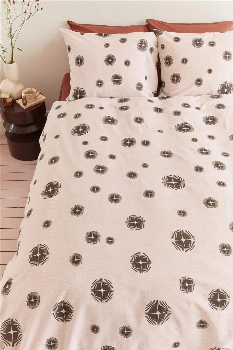 Genießen Sie einen ruhigen Schlaf unter dem Bettbezug Starshine von vtwonen. Das Design des Bettbezugs besteht aus Punkten aus handgezeichneten Ornamenten in verschiedenen Größen, die an Sterne erinnern. Die leinenartige Textur des Hintergrunds verleiht ihm einen ethnischen Touch. Die Farben Creme und Altrosa verleihen dem Bettbezug ein weiches und beruhigendes Aussehen. Beide Seiten des Bettbezugs haben das gleiche Muster.