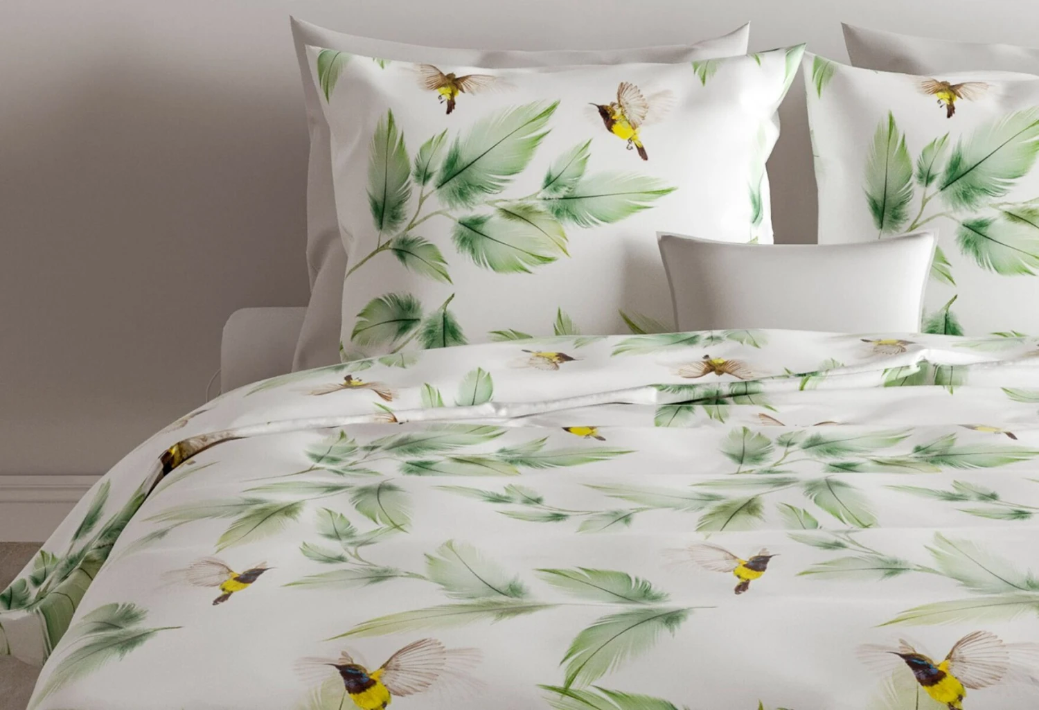 Mit dieser Bettwäsche holen Sie sich eine Prise Natur ins Schlafzimmer. Die mit feinem Pinselstrich gezeichneten Blätterzweige und die fröhlich flatternden Kolibris auf cremeweißem Hintergrund machen diesen Bettbezug zu einem echten Hingucker. Die BSCI-zertifizierte Bettwäsche aus 100% Baumwollsatin hat eine edle Ausstrahlung, fühlt sich wunderbar weich an und ist besonders luftdurchlässig sowie feuchtigkeitsabsorbierend.
